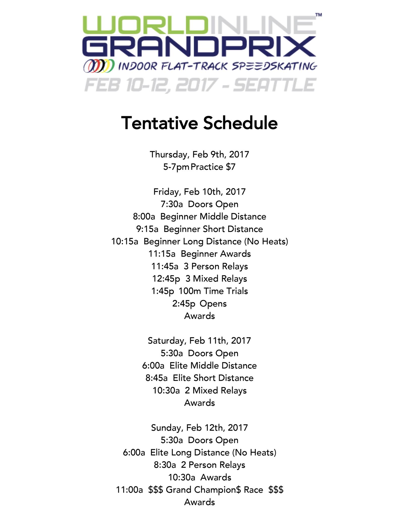 We wanted to get out some basic info for the Tacoma Invitational. We are excited to be hosting this for our 3rd straight year. We know it’s early on in the season so we added some fun events for those of you who aren’t quite ready to race division yet. We are doing a 3 person this year. The teams can be mixed or all guys or all girls. It’s 3 laps 3 times. In addition to this we will still have our 3 person pro-am race, where you will get to pick your favorite NSC skater to compete on your team, and we are still doing the 100m Time Trial. Please spread the word. NSC trials will be hosted during the meet like previous years, and the NSC pro night will be on Sat. We are working the schedule so we can add some of the younger divisions to race during NSC pro night to showcase some of the younger talent in our sport. See all of you soon. Robin Olson will be sending out the entry forms to your Coaches soon.