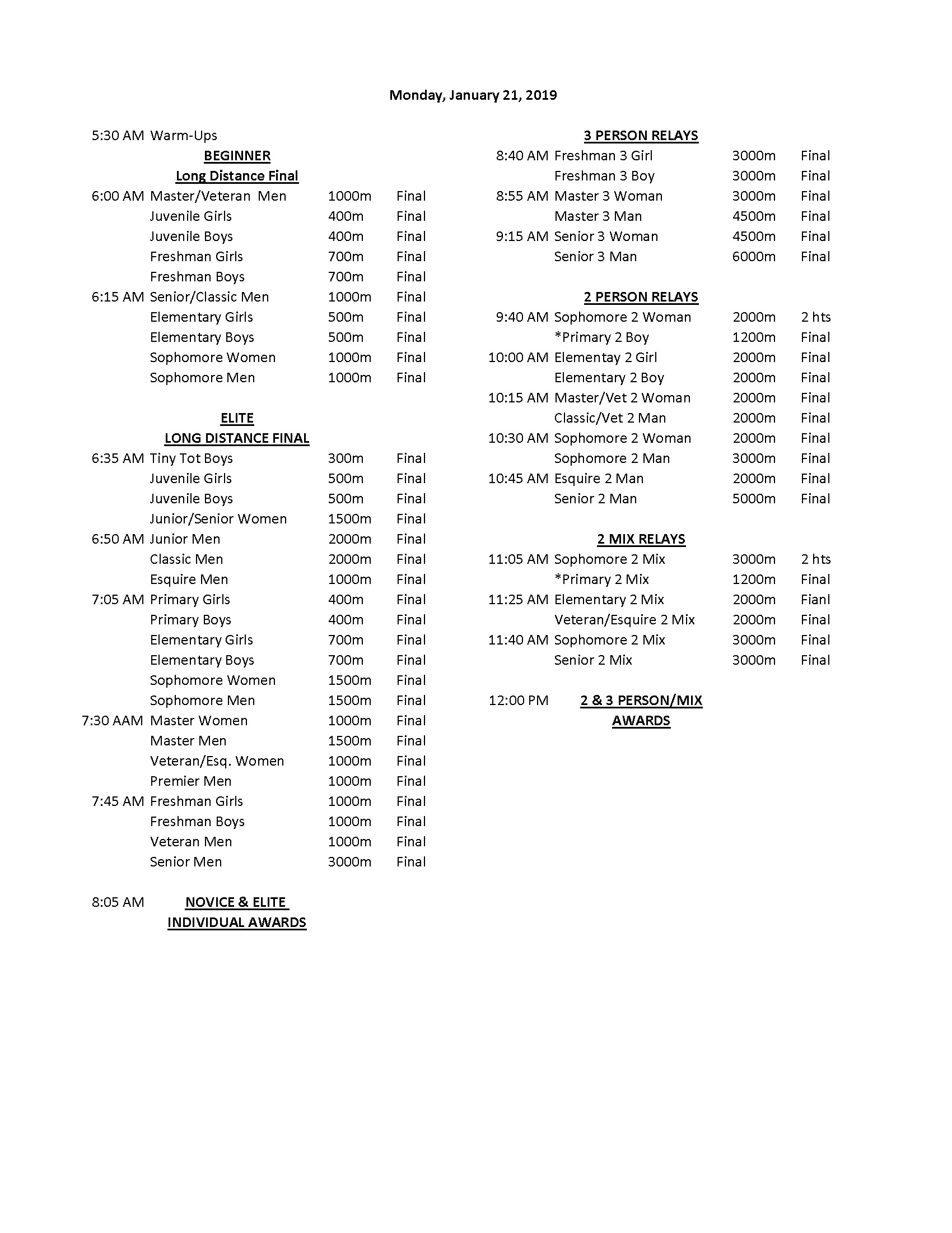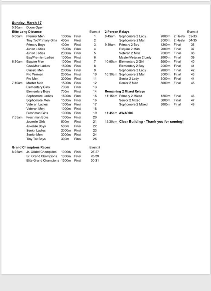 - July 30 – August 6, 2019: Indoor National Championships – Spokane, WA (Results)