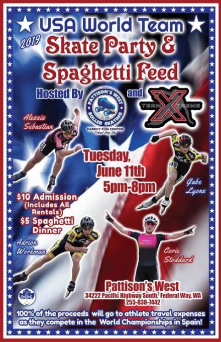 On Tuesday, June 11, 2019, 5:30 to 8 p.m., Pattison’s West will host a spaghetti feed in support of our four young inline speed skaters who qualified to represent the USA at the World Roller Games July 7-14, 2019, in Barcelona, Spain. The fundraiser will include raffles, auctions and a wine pull. Raffle and auction items will be accepted until the day of the event, and currently include a $600 value Salon Julian haircut, foil and haircut, color, and facial, as well as several skating-related items! The food is guaranteed to be fantastic. Skating parents have to feed their athletes, some of whom train hours daily and seem to eat constantly. What’s not to love? Great people, incredible food, fun items to bid on, wine, and skating! Don’t miss this event! World Roller Games: